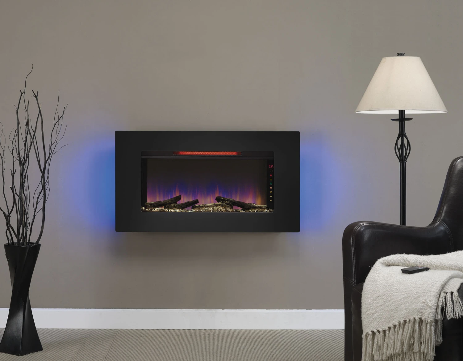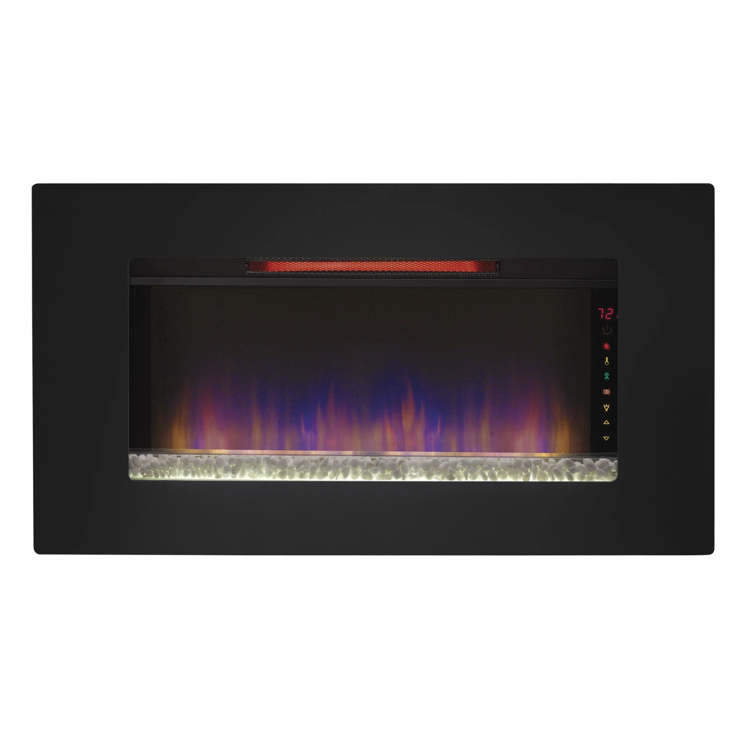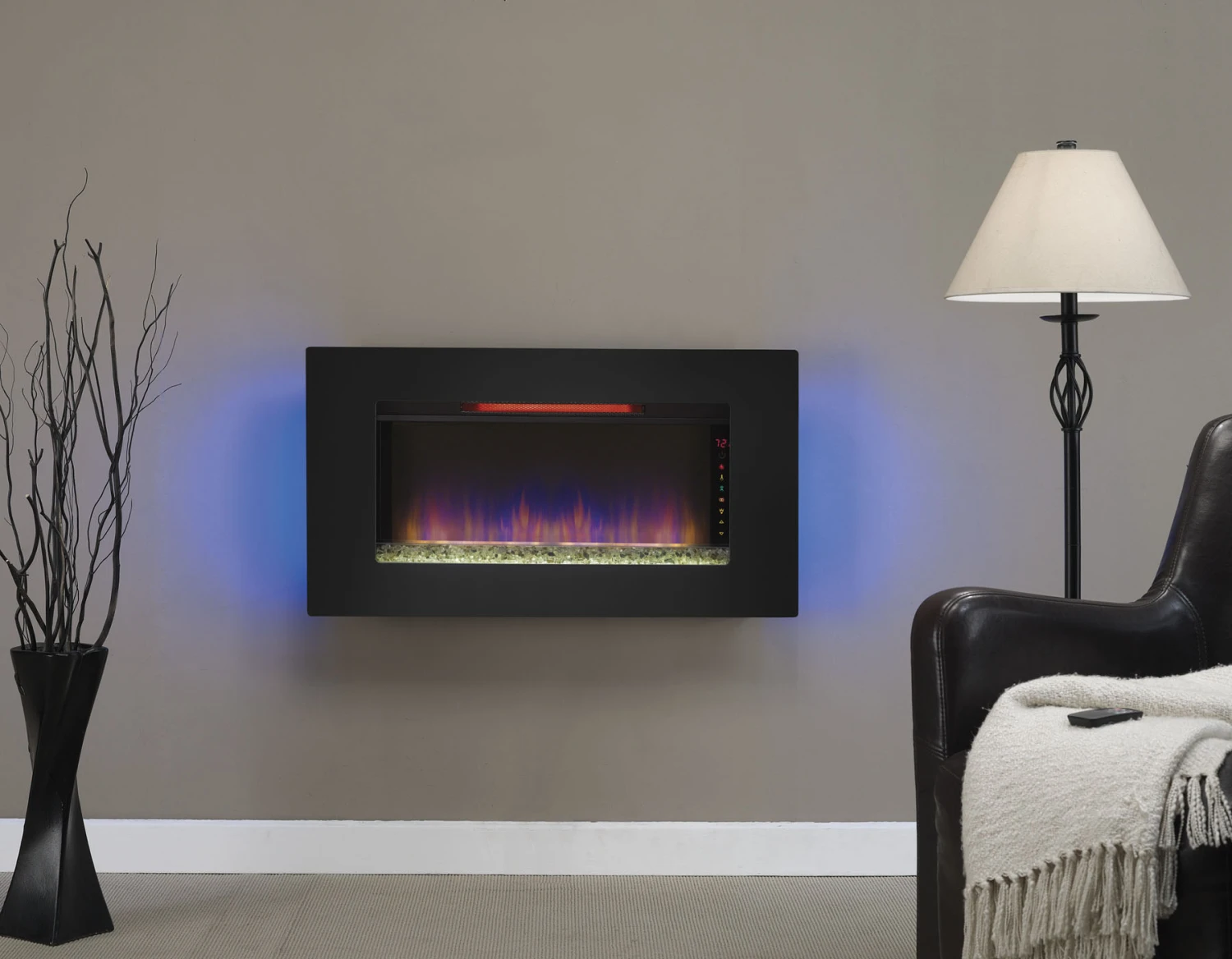 The Elysium 36″ wall mounted infrared quartz electric fireplace lets you maintain a safe, moist heat in your home without venting or gas lines. The Elysium can be hung as wall decor, mounted in a wall or can also stand independently using the included custom display stand providing the look of a roaring fire year round with or without heat. The heater provides supplemental zone heating for up to 1,000 square feet with 3 infrared quartz elements that are controlled by the adjustable thermostat. There are many ways to customize your fireplace with 3 media types included – translucent fire glass, ivory river rocks or rustic driftwood. Spectrafire™ offers 3 blue flame brightness settings and an additional setting with a traditional flame effect. Other features include a decorative LED sidelight that glows with five color options: Amber, Blue, Amber & Blue, Color Cycling and Off. Slim line remote control, custom stand and wall mounting hardware included.