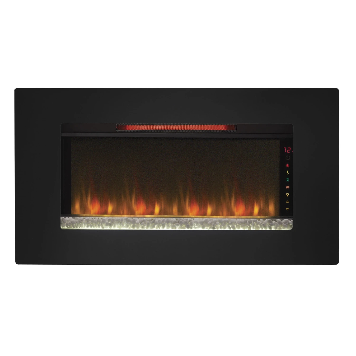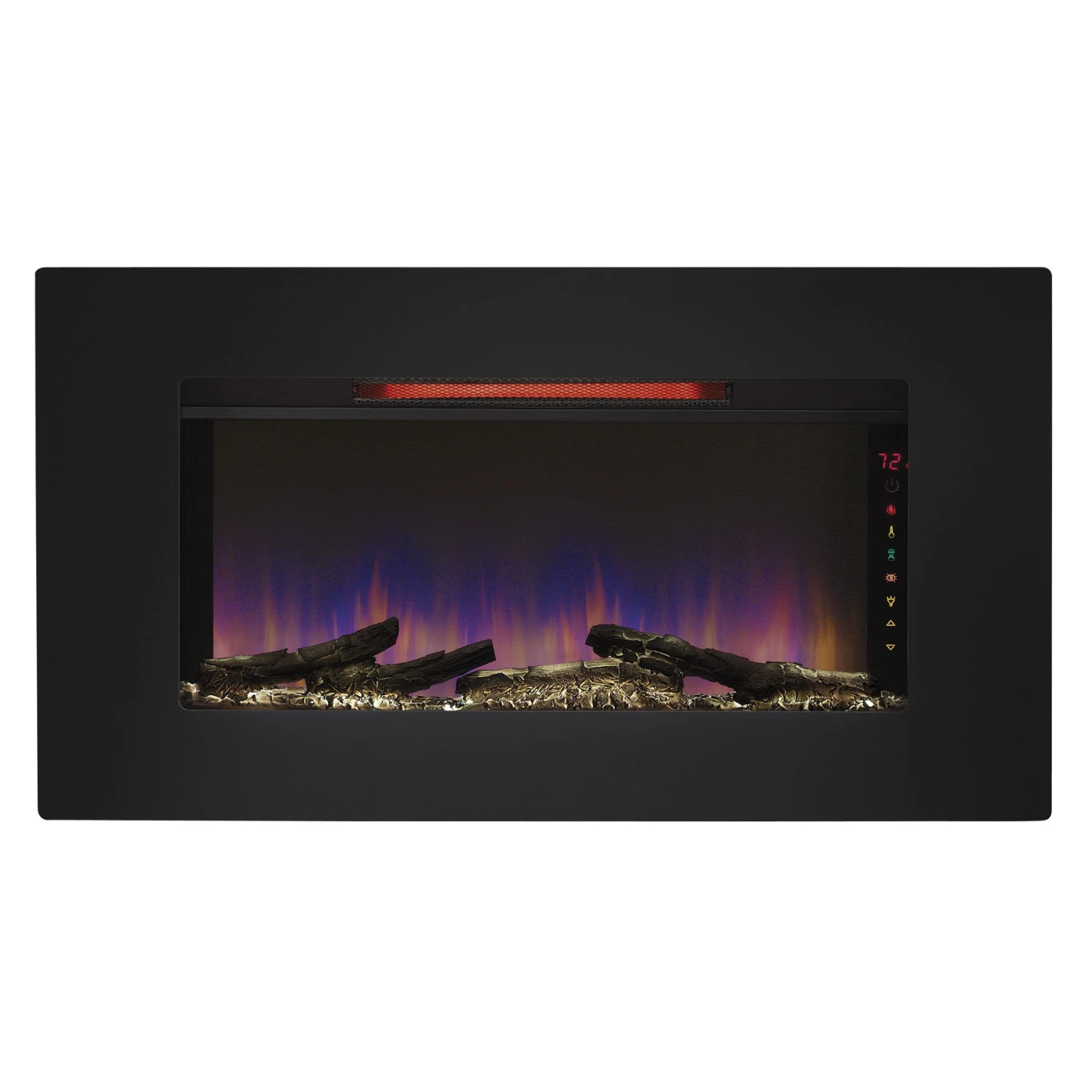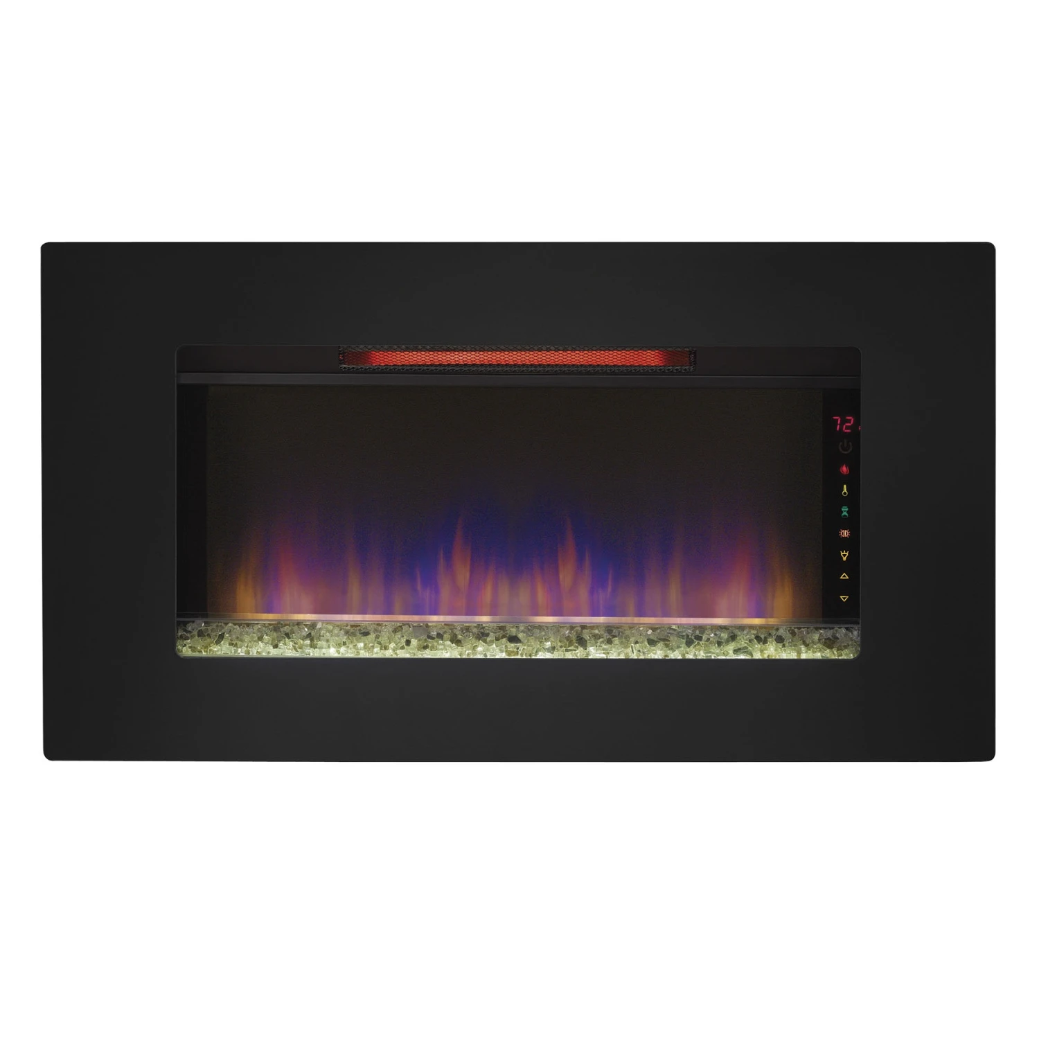 The Elysium 36″ wall mounted infrared quartz electric fireplace lets you maintain a safe, moist heat in your home without venting or gas lines. The Elysium can be hung as wall decor, mounted in a wall or can also stand independently using the included custom display stand providing the look of a roaring fire year round with or without heat. The heater provides supplemental zone heating for up to 1,000 square feet with 3 infrared quartz elements that are controlled by the adjustable thermostat. There are many ways to customize your fireplace with 3 media types included – translucent fire glass, ivory river rocks or rustic driftwood. Spectrafire™ offers 3 blue flame brightness settings and an additional setting with a traditional flame effect. Other features include a decorative LED sidelight that glows with five color options: Amber, Blue, Amber & Blue, Color Cycling and Off. Slim line remote control, custom stand and wall mounting hardware included.