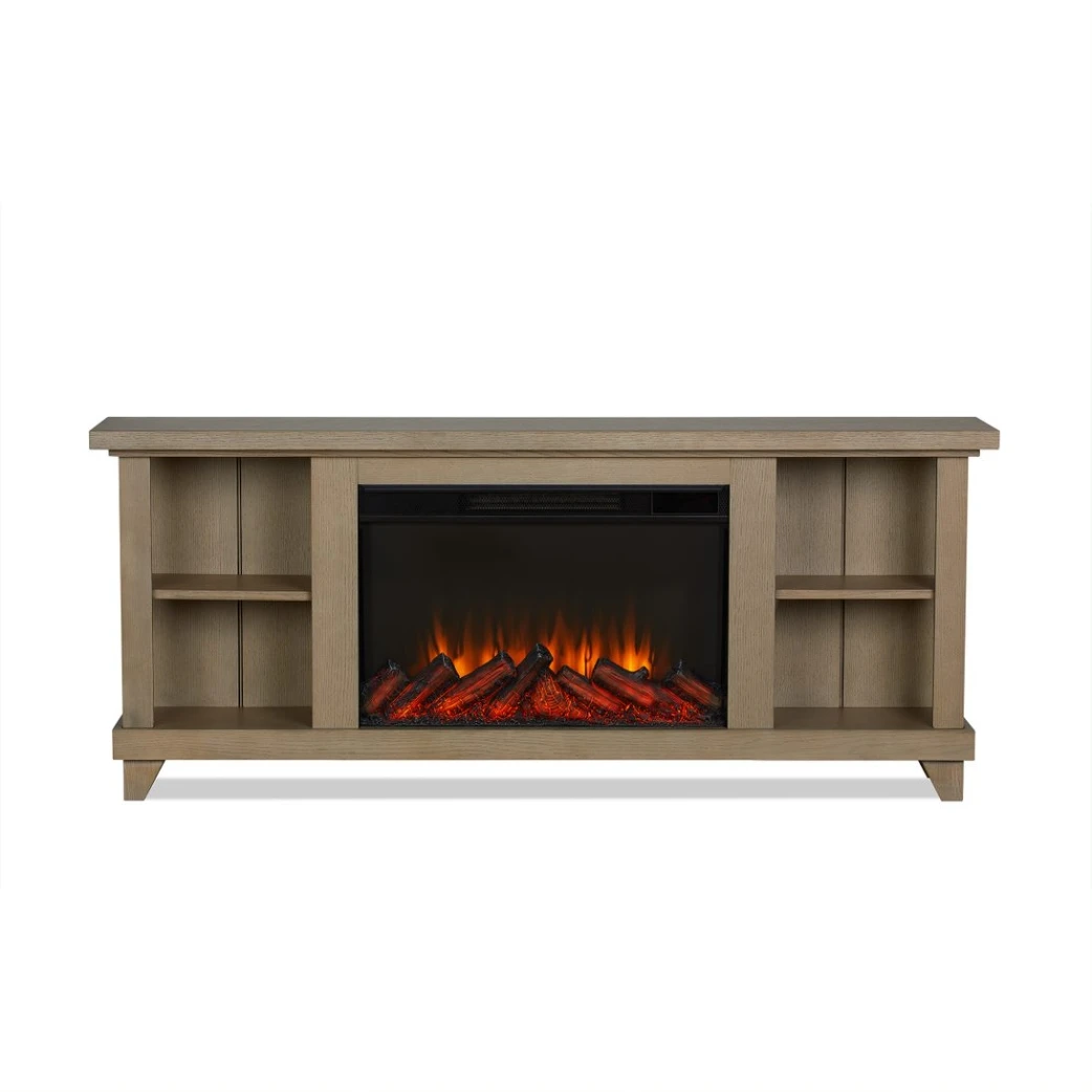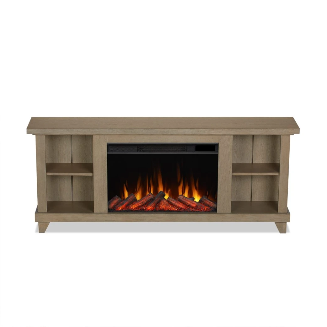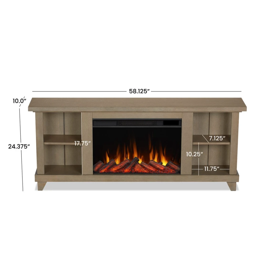 | The Penrose Media Console Electric Fireplace has a depth of only 10″ making it perfect for smaller spaces like apartments or offices. With plenty of storage space for electric components and decorative items, this TV stand is practical and charming. The Vivid Flame Electric Firebox mimics the look of a real fire, but does not require a chimney or vents and plugs into a standard outlet for convenient set up. Features include multiple flame colors, five brightness settings and dynamic glowing embers.