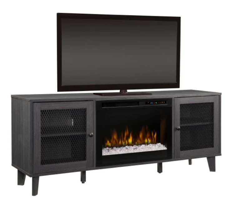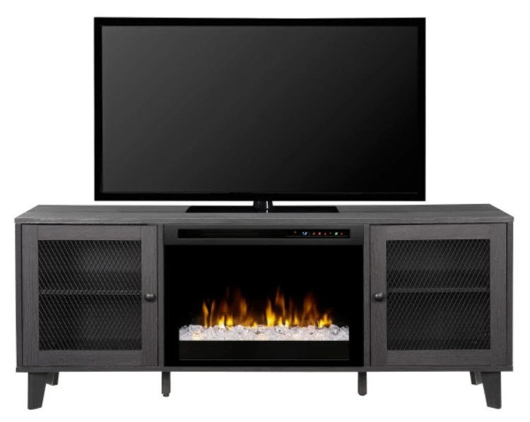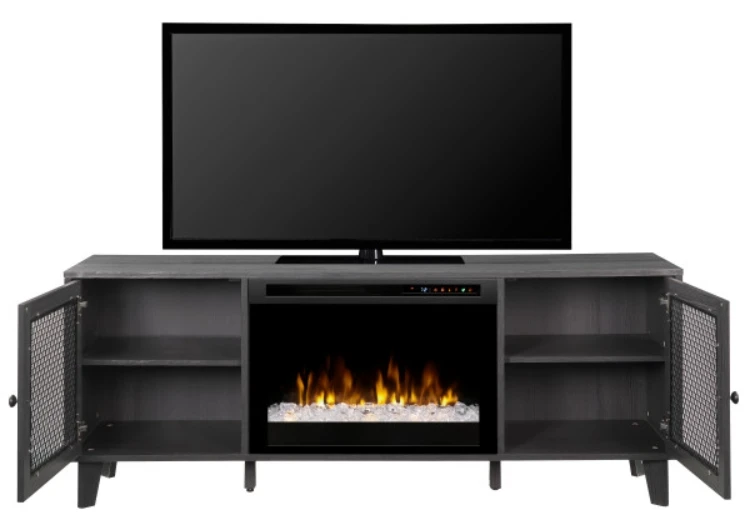 | With its low-profile construction and industrial chic style, the Dean Electric Fireplace Television Stand is right at home in modern spaces as a complementary design piece. Features a dazzling 26″ Dimplex Electric Fireplace at the center of the console. Supporting flat screen televisions up to 60″, the clean console top is reinforced with two additional support legs. Also featuring twin cabinets with a single adjustable shelf on either side of the unit and cord management, the Dean easily stores your media needs. Finished in a stylish Wrought Iron grey, the Dean Electric Fireplace Television Stand will easily adapt to any changing design.