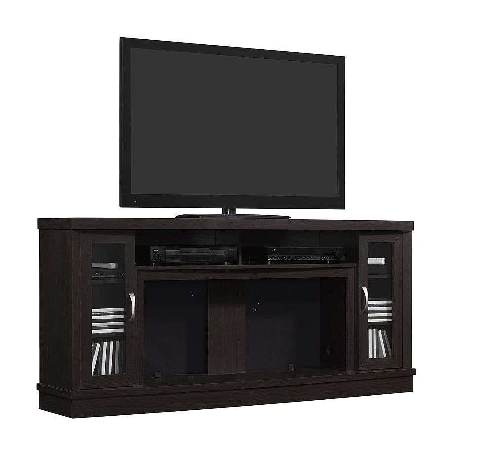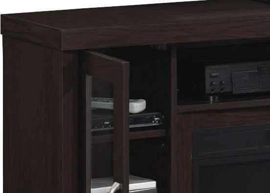 The Hutchinson TV stand for TVs up to 80” offers a warm yet modern design that goes well with many décor styles. It features plenty of storage with a full length shelf with recessed partition, perfect for media components. The two side cabinets offer ample storage for media accessories, books, CDs and remotes. Pass through holes neatly route wires and cables while providing ventilation for components. 42II042FGT Infrared Fireplace Insert Product Description (included with purchase): To add warmth and inviting ambiance to your home, add this 42” infrared quartz electric fireplace insert to your mantel or TV stand. The infrared quartz heat helps to maintain the natural humidity in the air, resulting in moist, comfortable heat without drying out the room’s air. Providing supplemental zone heating for up to 1,000 square feet and showcasing stunning flame effects, this electric fireplace is sure to create a welcoming environment. Patent pending 3D flame effect technology offers a layered flame effect to create a truly realistic fire experience. The customizable 3D flame effect technology offers 125 selectable effect options to create your ideal fire, displayed on a realistic log set and ember bed or contemporary tray with large glass rocks (both options included). Five flame speed settings allow you to adjust from a fast roaring fire down to a gentle flickering flame, while five adjustable brightness settings allow you to select the perfect fire display for any occasion. Flame effect colors include Spectrafire, Sapphire, Amethyst, Campfire, Midnight Fire and auto cycle. The flame effects can be used with or without heat for year-round enjoyment. Change the settings easily using the control panel on the unit or with the included remote control. Use this fireplace worry-free as it is equipped with Safer Plug™ and Safer Sensor™ fire prevention technology. Safer Plug™ continuously monitors the temperature of the plug, and will turn off automatically if overheating occurs. Safer Sensor™ fire prevention technology alerts you when the heater is obstructed and will automatically shut off to prevent damage. This insert powers the LED lights on compatible TV stands and mantels.