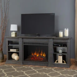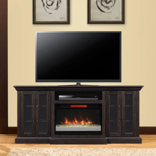On-trend yet classic, the Grand TV stand for TVs up to 80″ and up to 155 lbs. will be the centerpiece of any room’s decor. The Espresso Pine finish, Brushed Gunmetal hardware, crown molding and large base make this TV stand a classical contemporary addition to your home. Store your media components and accessories in the open display shelf and the two glass-front side cabinets with adjustable shelves. Customize your TV stand with a ClassicFlame 26″ electric fireplace insert. 26II042FGL Infrared Fireplace Insert Product Description (included with purchase): To add warmth and inviting ambiance to your home, add this 26″ infrared quartz electric fireplace insert to your mantel or TV stand. The infrared quartz heat helps to maintain the natural humidity in the air, resulting in moist, comfortable heat without drying out the room’s air. Providing supplemental zone heating for up to 1,000 square feet and showcasing stunning flame effects, this electric fireplace is sure to create a welcoming environment. Patent pending 3D flame effect technology offers a layered flame effect to create a truly realistic fire experience. The customizable 3D flame effect technology offers 125 selectable effect options to create your ideal fire, displayed on a realistic log set and ember bed. Five flame speed settings allow you to adjust from a fast roaring fire down to a gentle flickering flame, while five adjustable brightness settings allow you to select the perfect fire display for any occasion. Flame effect colors include Spectrafire, Sapphire, Amethyst, Campfire, Midnight Fire and auto cycle. The flame effects can be used with or without heat for year-round enjoyment. Change the settings easily using the control panel on the unit or with the included remote control. Use this fireplace worry-free as it is equipped with patent pending Safer Plug™ and Safer Sensor™ fire prevention technology. Safer Plug™ continuously monitors the temperature of the plug, and will turn off automatically if overheating occurs. Safer Sensor™ fire prevention technology alerts you when the heater is obstructed and will automatically shut off to prevent damage. This insert powers the LED lights on compatible TV stands and mantels. 26II310GRG-201 Infrared Fireplace + Contemporary Insert Product Description: To add warmth and inviting ambiance to your home, add this 26″ infrared quartz electric fireplace insert to your mantel or TV stand. The infrared heat helps to maintain the natural humidity within the air, resulting in moist, comfortable heat without drying out the room’s air. Providing supplemental zone heating for up to 1,000 square feet and showcasing stunning flame effects, this electric fireplace is sure to create a welcoming environment. Spectrafire® Plus customizable flame effect technology offers 125 selectable effect options to create your ideal fire, displayed on a contemporary, silver tray with clear crystal rocks. Five flame speed settings allow you to adjust from a fast roaring fire down to a gentle flickering flame, while five adjustable brightness settings allow you to select the perfect fire display for any occasion. Flame effect colors include Spectrafire, Sapphire, Amethyst, Campfire, Midnight Fire and auto cycle. The flame effects can be used with or without heat for year round enjoyment. Change the settings easily using the control panel on the unit or with the included remote control. The on-screen function indicator displays thermostat settings and icons to show the current status of insert functions. Use this fireplace worry free as it is equipped with Safer Plug fire prevention technology. Safer Plug continuously monitors the temperature of the plug, and will turn off automatically if overheating occurs to prevent electrical fire, circuit or product damage.