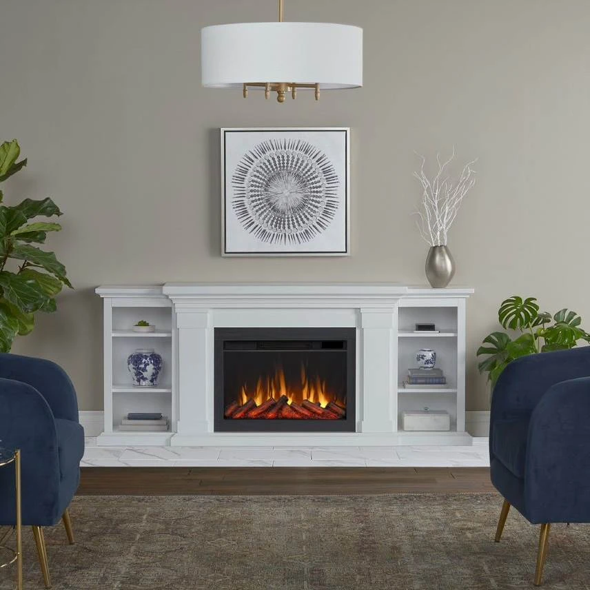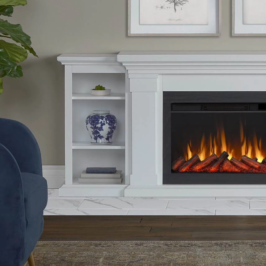| The Winterset Media Electric Fireplace has a clean, timeless design and plenty of storage space. The long mantel can accommodate a wide screen TV, and with a depth of only 13.5″ this entertainment center is ideal for smaller spaces such as offices or apartments. Part of the Real Flame Slim Series, this electric firebox mimics the look of a real fire but does not require a chimney or vents and conveniently plugs into a standard outlet. Features include six flame color options, an adjustable thermostat that provides supplemental heat, and the option to run heatless flames for year-round enjoyment.