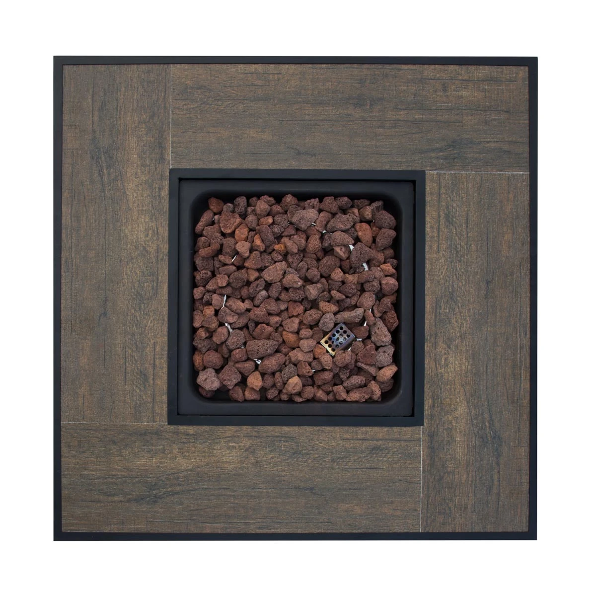 5 pcs fire pit set. Utilizes standard 20 lb. LP gas cylinder. Chairs are all-weather resin wicker over rust-resistant steel frames. 30-inch square top fire pit has wood-look table surround and 50,000 BTU stainless steel burner Enjoy the fire’s warm glow with family and friends around this 5-pc. fire pit set. And the LP fire pit means you can light it up anytime, no need to worry about gathering wood. Chairs are all-weather resin wicker over rust-resistant steel frames. 30-in sq. fire pit has wood-look table surround and 50,000BTU stainless steel burner. Pillows sold separately. Product Details
